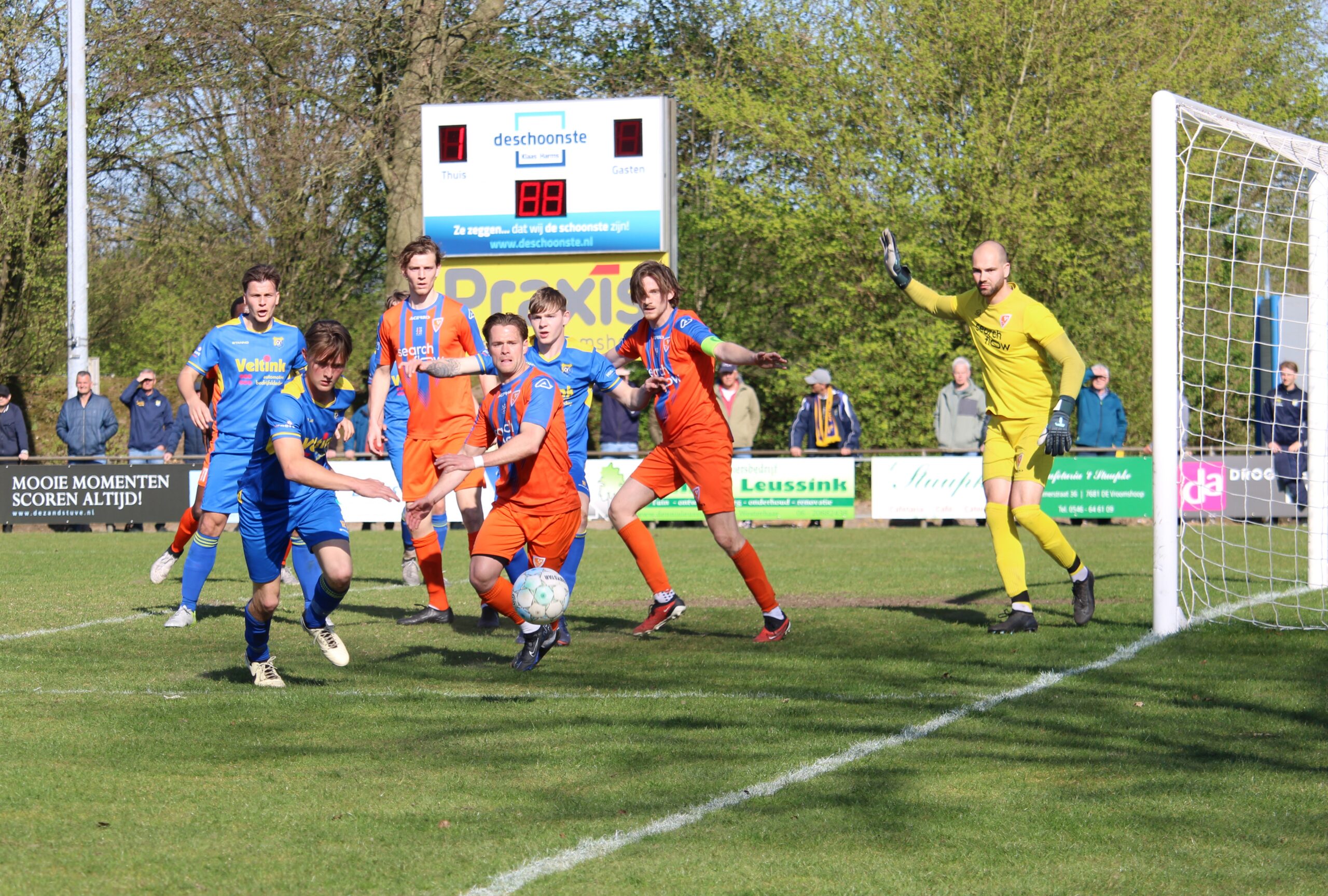 Op het zonovergoten sportcomplex Bosrand wist Vroomshoopse Boys wat het te doen stond tegen naaste rivaal Oranje Nassau uit Almelo. Alleen winst telde tegen de oranjehemden, die voor aanvang van deze subtopper slechts één punt achterstonden op het team van hoofdtrainer Robert Bosma en assistent René Netters. In de openingsfase speelde zich de wedstrijd vooral op het middenveld af, waarbij vele persoonlijke duels werden uitgevochten. De patstelling werd in de 23e minuut doorbroken. Een hoge bal werd verkeerd ingeschat door Oranje Nassau-keeper Thom te Riet. De doelman en in meerdere verdedigers van de gasten moesten het in een luchtduel afleggen tegen rechter vleugelverdediger Jesper Derks, die raak knikte: 1-0.