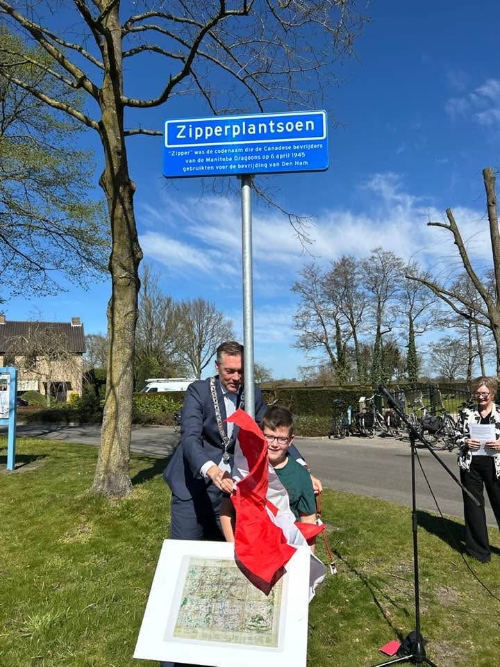 Ook burgemeester Hans Broekhuizen benadrukte bij de onthulling van het straatnaambord dat belangrijk is om de oorlogsgeschiedenis te kennen en daarvan te leren. “Vrijheid vraagt om respect naar elkaar toe, maar ook om waakzaamheid. Dat zien we maar al te goed in de wereld om ons heen. Daarom is het belangrijk dat we weten wat er gebeurd is en dat we ons met elkaar moeten inzetten om oorlog te voorkomen.” Samen met één van de buurtkinderen, Gijs Huisman, onthulde hij vervolgens het straatnaambord. “Zipper” verwijst naar de codenaam, die de Canadezen aan Den Ham hadden gegeven op hun landkaarten.
