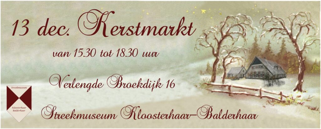Kerstmarkt 13 december van 15:30 uur – 18.30 uur bij het Streekmuseum Kloosterhaar-Balderhaar aan de Verlengde Broekdijk 16 in Kloosterhaar.