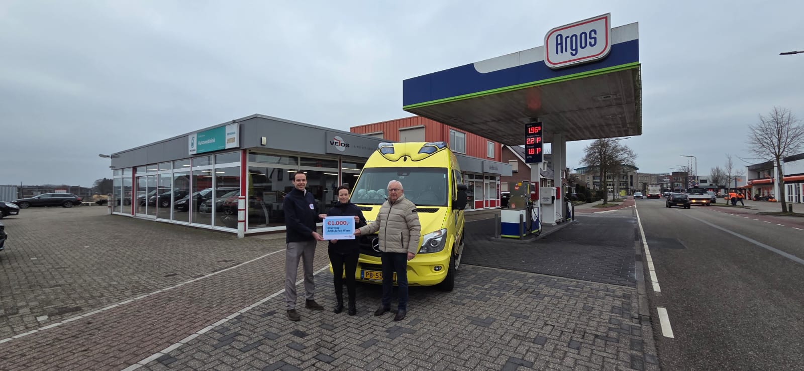 De ambulances en promotieauto van de stichting tanken structureel bij het tankstation van Autobedrijf Webbink. De gunstige ligging van Vroomshoop op de route maakt deze locatie tot een vaste uitvalsbasis voor brandstofvoorziening. Dankzij de samenwerking met Argos Tankstation ontvangt de stichting al korting op de brandstofprijs op alle stations van Argos in Nederland. Dit heeft geresulteerd in een donatie van € 1.000, waarmee de stichting nog meer wensen kan realiseren voor haar doelgroep in de provincie Overijssel.