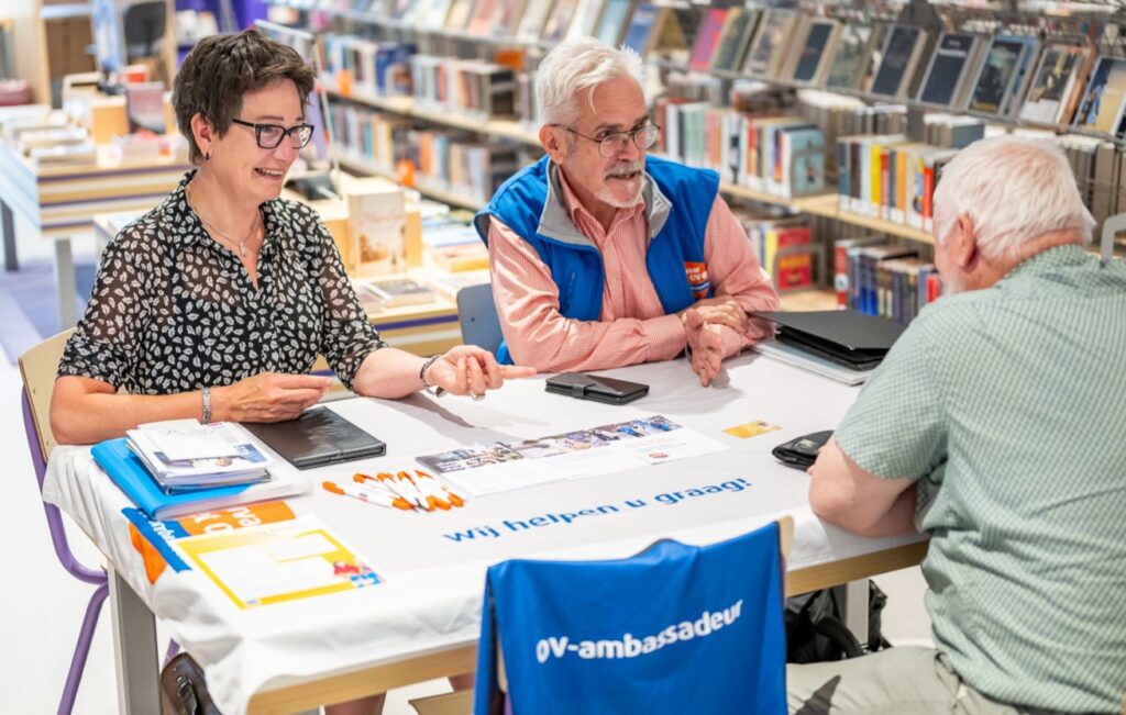 Tijdens een OV-inloopspreekuur kunt u uw persoonlijke vragen stellen aan OV-ambassadeurs. Zij kunnen u vertellen hoe u kunt reizen met de OV-chipkaart, de bankpas of met OVpay (de betaalapp op de mobiele telefoon). Ze kunnen uitleg geven over het in- en uitchecken bij verschillende vervoerders en adviseren welk abonnement er bij u past. Heeft u daarnaast nog andere vragen over bijvoorbeeld de buurtbus en andere vervoersmogelijkheden in uw regio? Loop dan vrijblijvend binnen. De OV-ambassadeurs nemen rustig de tijd om uw vragen te beantwoorden. Inge (67 jaar): “Samen met een OV-ambassadeur heb ik de reisplanner-app en OVpay op m’n telefoon gezet en ermee geoefend. Nu reis ik regelmatig en duurzaam met het OV naar de stad.”